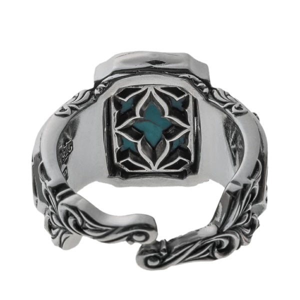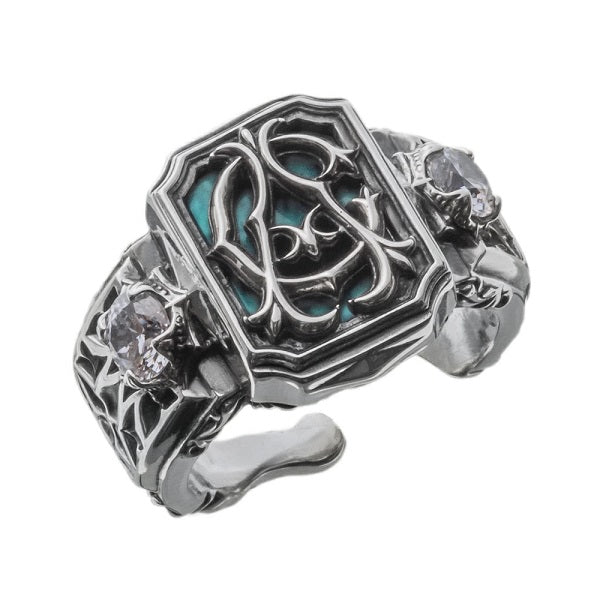 唐草風に透かし彫りした「AC」イニシャルの下に、アマゾナイトカラーの大理石を敷いた印台リング。