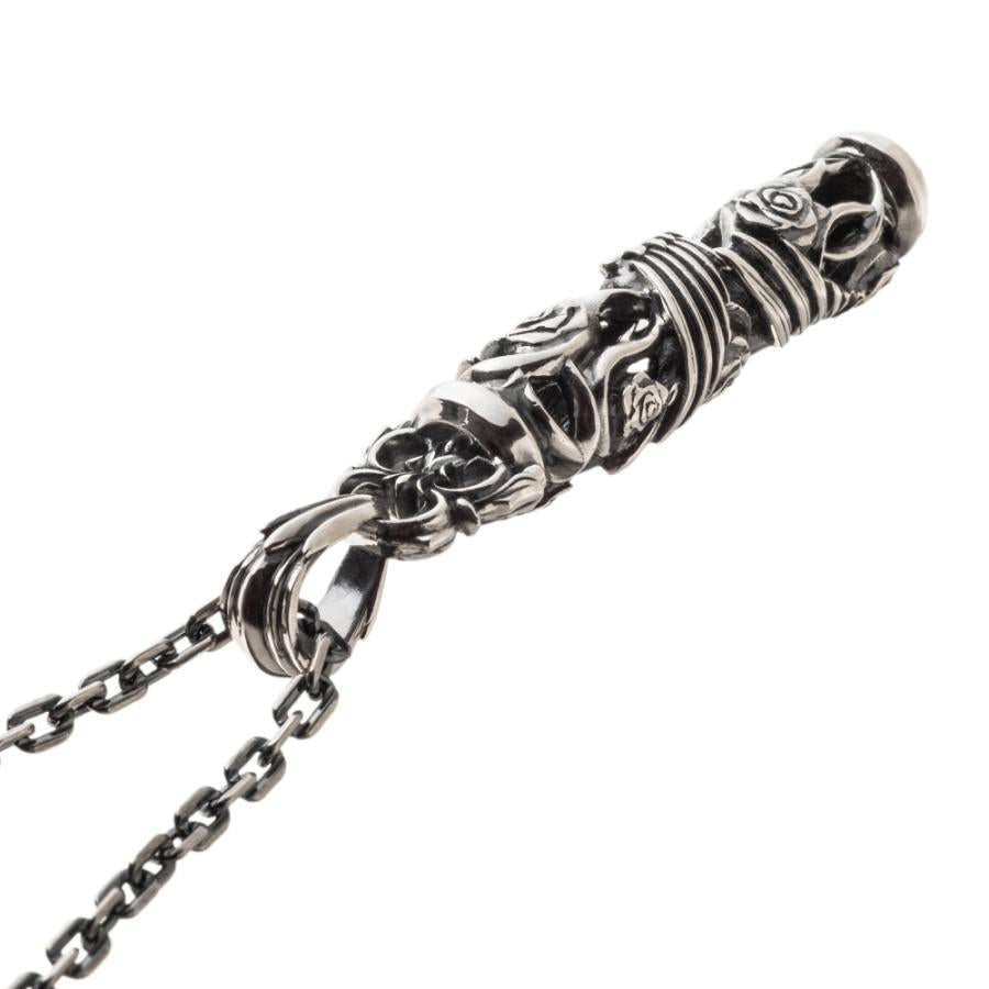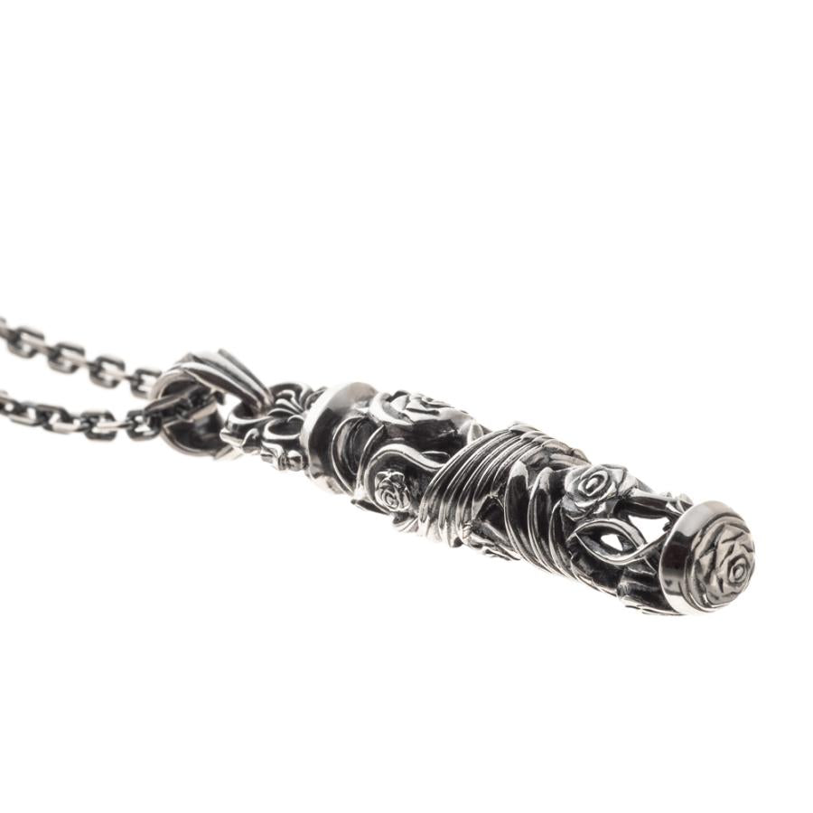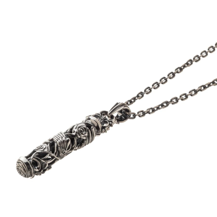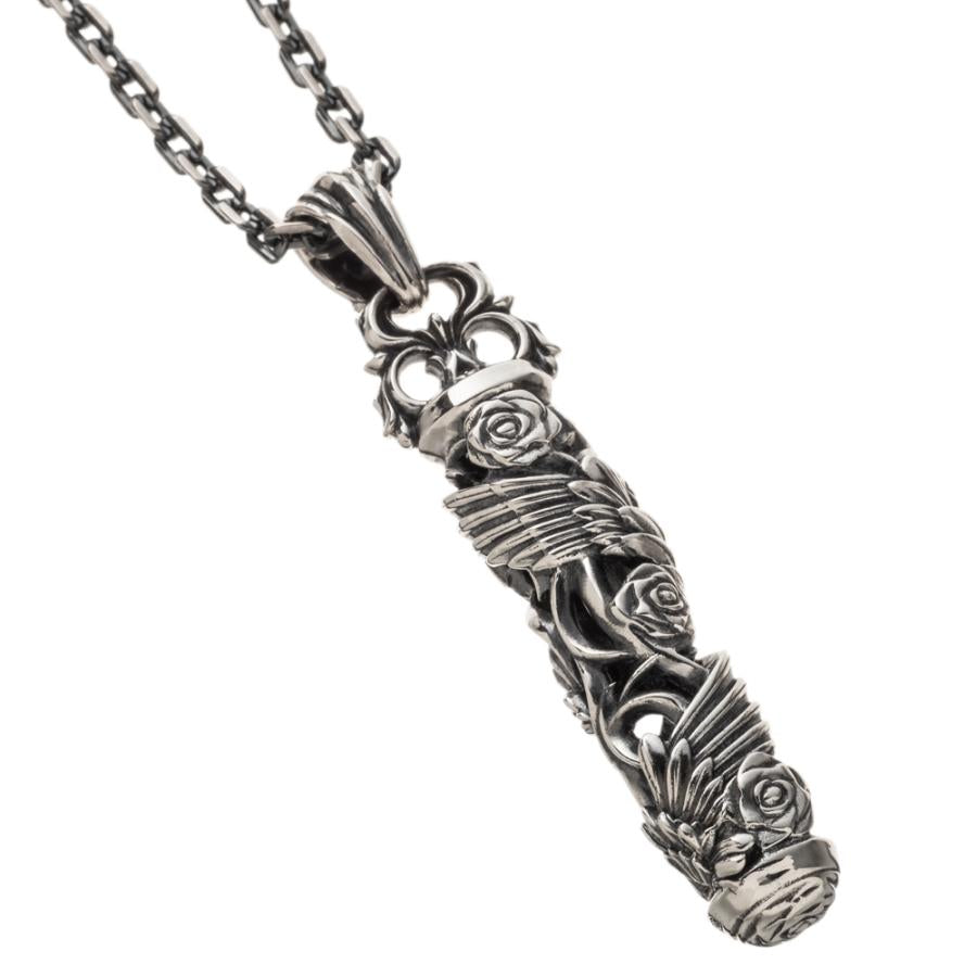 筒状のトップに唐草と薔薇、翼を巻き込む様に描き込んだペンダント。